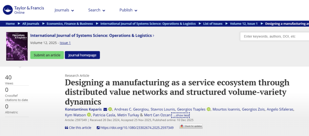 We are happy to announce another important publication stemming from the research conducted in Tec4MaaSEs. The article “Designing a manufacturing as a service ecosystem through distributed value networks and structured volume-variety dynamics” by Kaparis, K., Georgiou, A. C., Lounis, S., Tsaples, G., Mourtos, I., Zois, G.,Sifaleras, A., Watson, K., Casla, P., Turkay M. and Ozcan, […]
